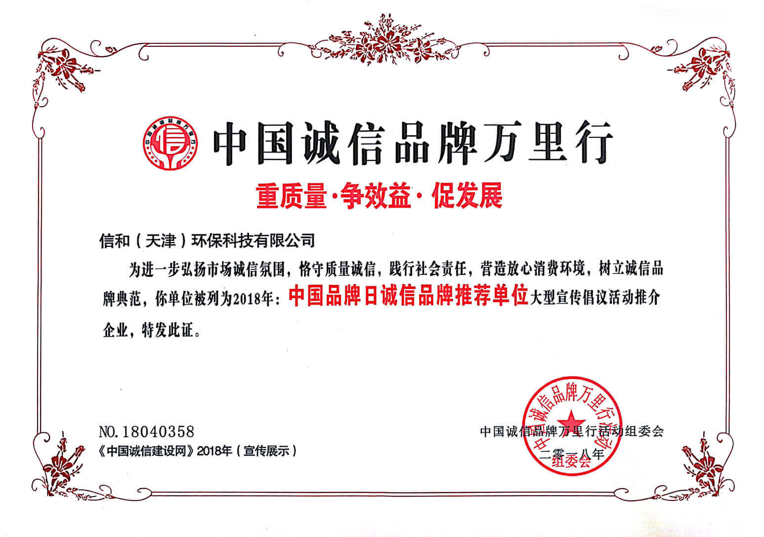 “質量就是生命”。信和重質量、守信用,被中國誠信品牌萬里行推薦“誠信示范單位”、“AAA資信等級”、“AAA級誠信經營示范單位”、“誠信經理人榮譽證書”、“誠信企業家榮譽證書”、“中國產品質量放心達標企業”、“誠信品牌聯盟會員單位”、“中國質量誠信AAA級品牌企業”、“中國百強優秀企業”、“節能環保推廣產品”、“全國科技創新企業”等榮譽稱號。